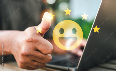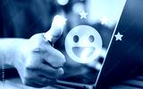 Businessman pressing smiley face emoticon on virtual touch screen.