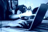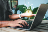 Hand pressing user and five star icon on visual screen for positive customer feedback.