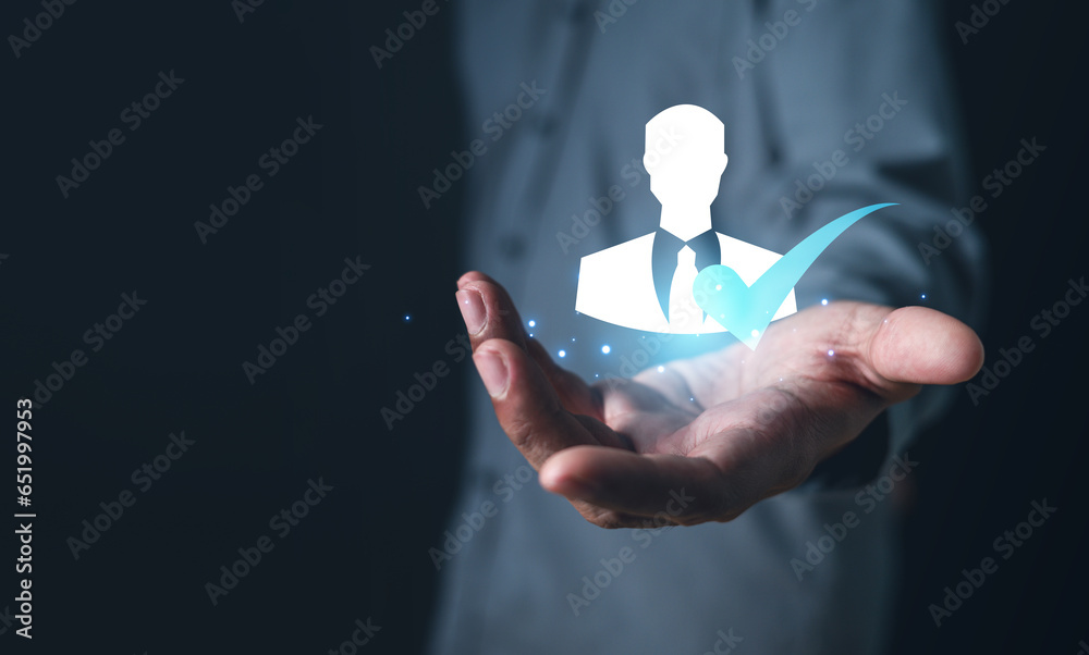 hr, employment, career, occupation, employee, recruitment, candidate, hiring, management, manager. close up to hand then hold checked mark talent candidate icon, then put in them to right job.