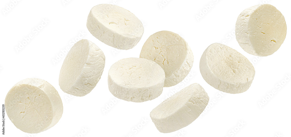 Flying mozzarella cheese slices isolated on white background, full depth of field