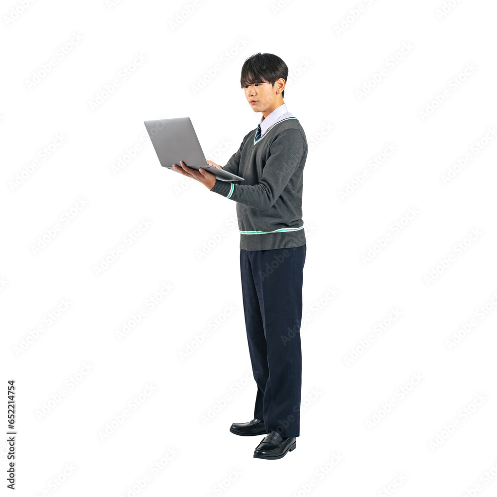 立ってノートパソコンを使う男子学生 背景透過切り抜きPNG