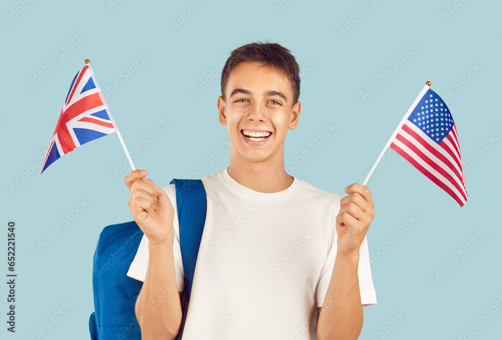 Happy male student learning English language. Studio portrait of school boy with backpack holding American and British flags, looking at camera and smiling isolated on light blue background