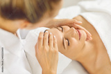 Close up portrait of a beautiful young woman lying with closed eyes and having face or head massage in spa. Woman relax enjoying health therapy treatment. Wellness and beauty day concept.