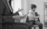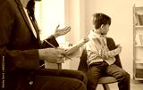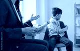 Child at psychologist's office. Kid refuses to talk, turns away and avoids eye contact. Resentful boy with communication and behaviour problems sitting on chair during therapy session with specialist