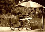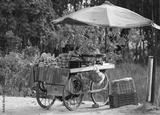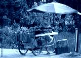 A fruit cart on the roadside in the city. Fresh seasonal fruits. street vendor hard work