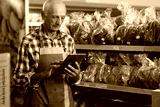 Elderly male worker standing in supermarket and typing on tablet. Senior man food store assistant at work tapping on device