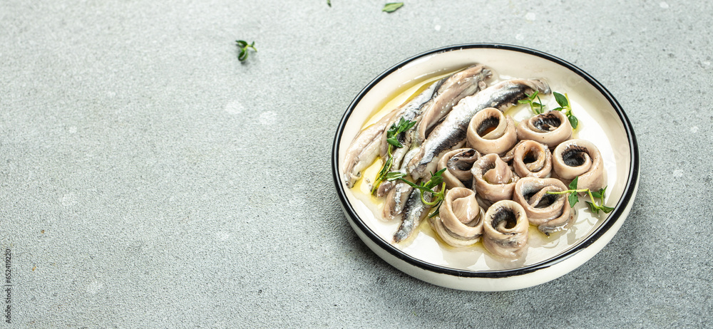 Anchovies fish fillet in Olive Oil on a light background. Long banner format. top view