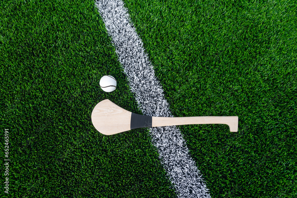 Hurling bat and sloitar on green grass. Horizontal sport theme poster, greeting cards, headers, website and app