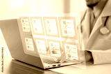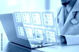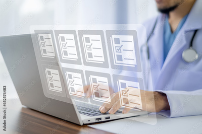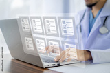 Doctor using computer Document Management System (DMS), online documentation database process automation to efficiently manage files