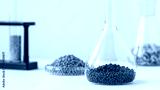 Plastic factory laboratory. Glass flasks with colored dye in granules for plastics. polymer industry.