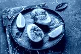 Avocado stuffed with tuna on a dark background. Low carb high fat breakfast. Healthy food concept. place for text, top view