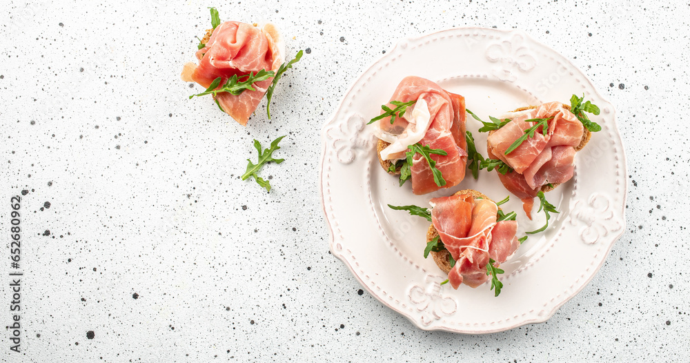 Toast with jamon serrano ham, prosciutto crudo parma. Long banner format. top view