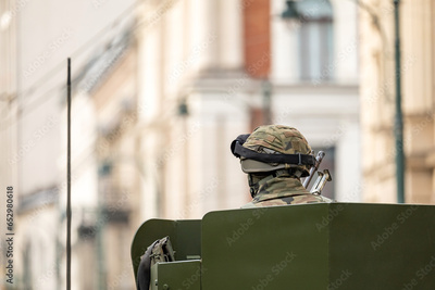 Anonymous unrecognizable generic soldier in an armored vehicle driving through urban city streets, copy space, blurred background. City warfare, war operations abstract concept, one person, news shot