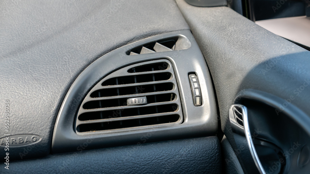 Generic used dusty air conditioner outlet vent in the car, interior object detail closeup, fixing, cleaning old car vehicle air conditioning system replacing air filters, maintenance simple concept