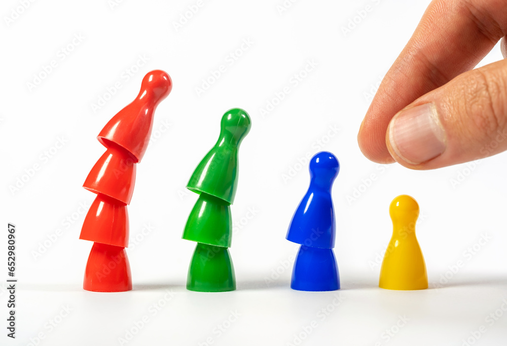 Man, hand arranging, sorting colorful game pieces building a team by stacking elements sorting by color type, group of people symbol. Stairs going up, corporate business chart growth abstract concept
