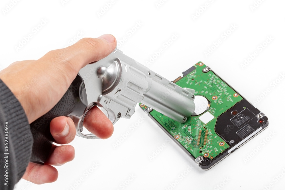 Man, hand holding a HDD disk drive at gunpoint, silver revolver aiming at private user data on a drive. Ransomware malware, phishing, hacking, files theft, permanent deletion simple abstract concept