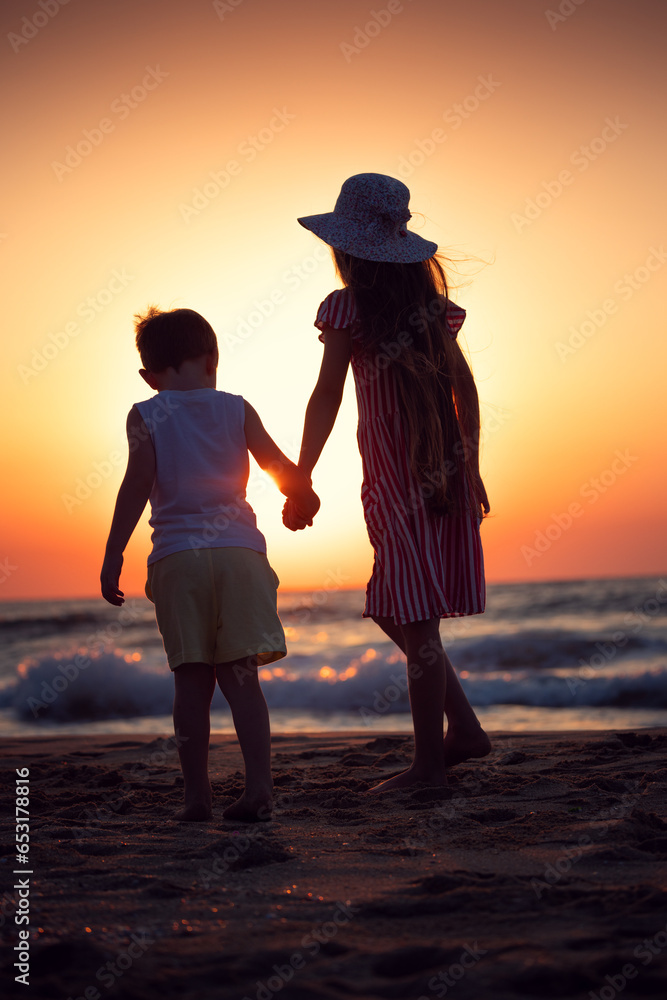 Sea sunrise and happy family on shore, walking brother and sister on the beach sand