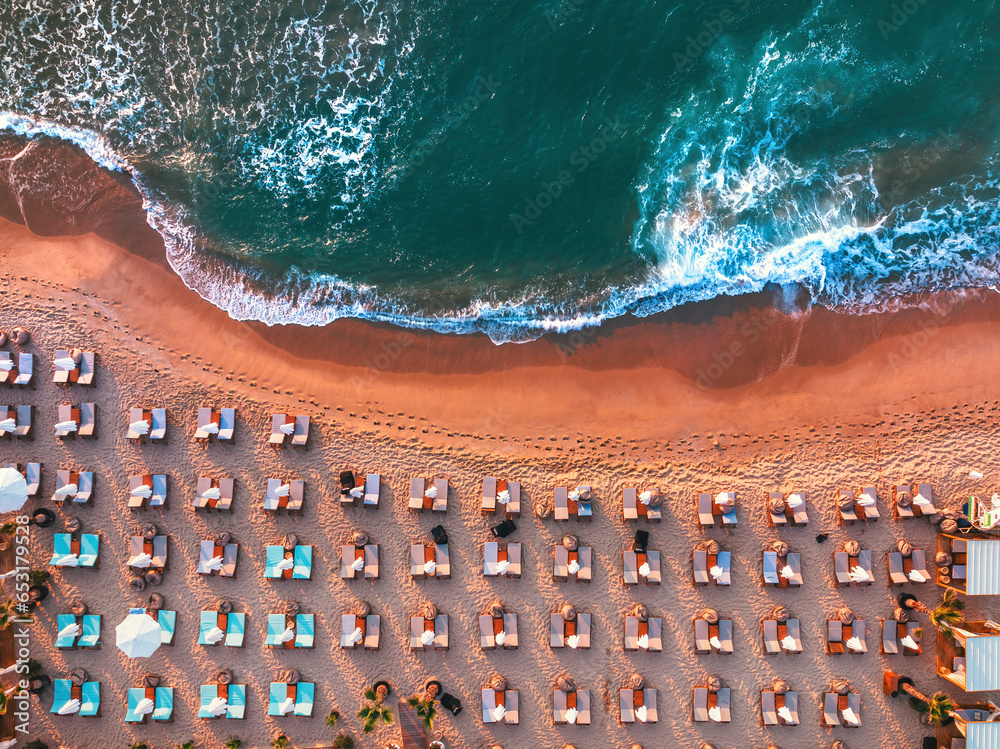 Aerial top view on the beach. Umbrellas, sand and sea waves during scenic sunrise