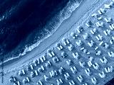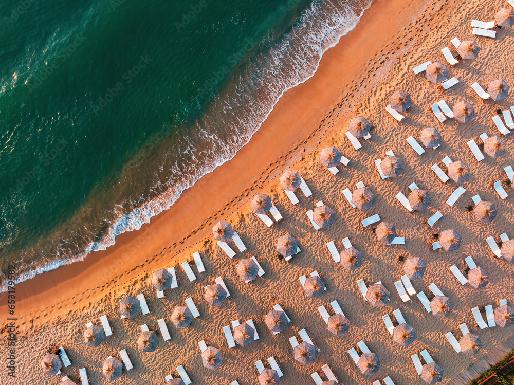 Aerial top view from drone of sandy beach with turquoise sea waves, parasols and lounge chairs with copy space for text