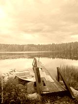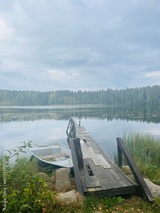 Cloudy weather at the lake, vintage wooden boat at the lake