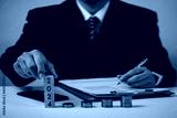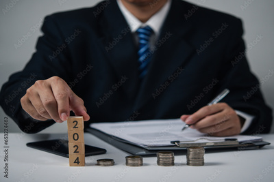 Businessman hand stacking wooden cube 2024 and coins stacking on desk. business Money Saving budget planning investment and Financial and tax concept.