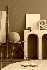 Warm and cozy living room interior with mock up poster frame, marble console, gold chair, slippers, stylish sculpture, carpet and personal accessories. Home decor. Template.
