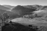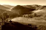 Mountain countryside homestead in the autumn. Wooden barns, aerial drone view