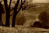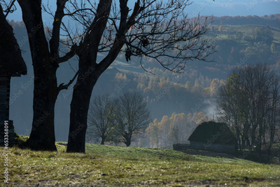 Countryside farmland in the autumn with thatched roof house, lodge, mountain cabin