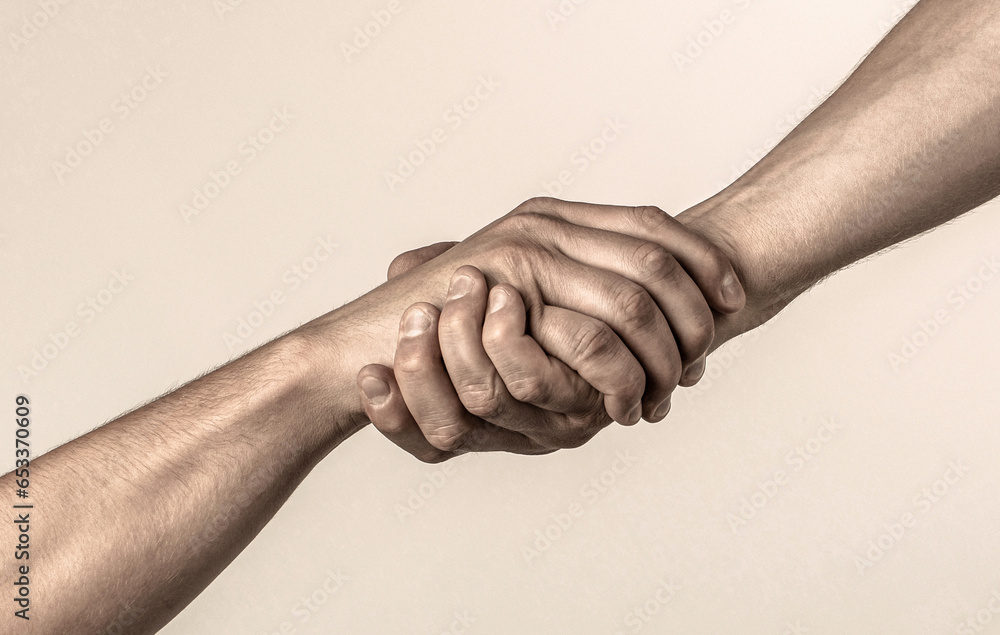 Lending a helping hand. Handshake, arms friendship. Friendly handshake, friends greeting, teamwork, friendship. Close-up.
