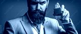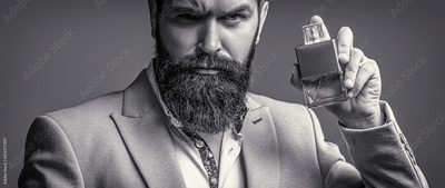 Perfume or cologne bottle, perfumery, cosmetics, scent cologne bottle, male holding cologne. Black and white