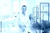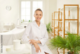 Portrait of a young smiling woman cosmetologist or beautician doctor sitting in a beauty spa salon office on her workplace and looking cheerful at camera. Cosmetology and skincare concept.