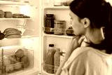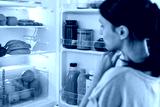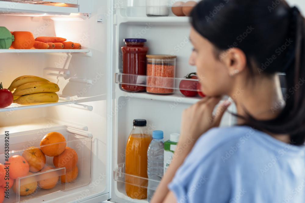 Shot of beauty young woman hesitant to eat in front of the fridge in the kitchen.