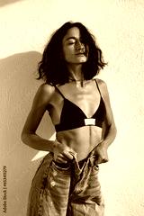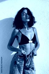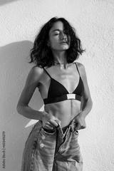 beautiful sexy brunette posing against a white wall in black lingerie and jeans