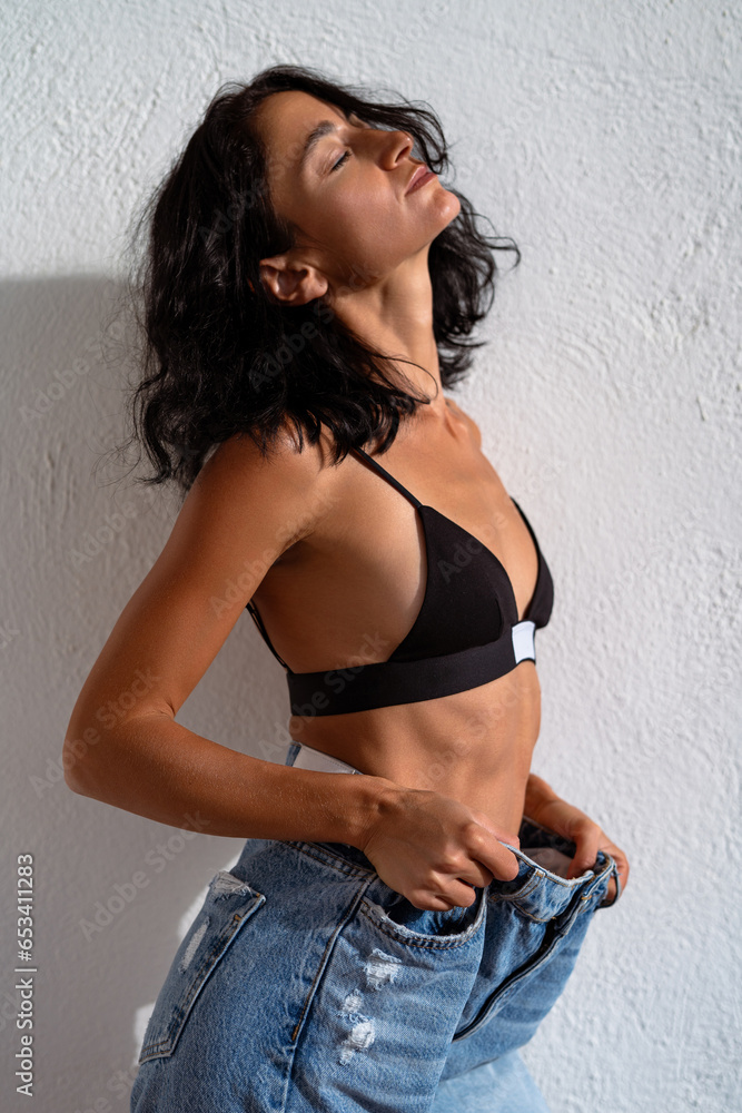 beautiful sexy brunette posing against a white wall in black lingerie and jeans