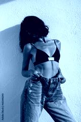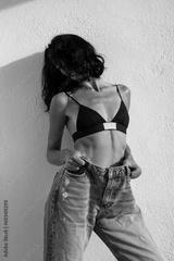 beautiful sexy brunette posing against a white wall in black lingerie and jeans