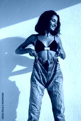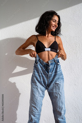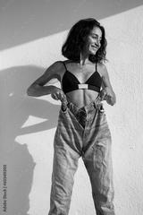 beautiful sexy brunette posing against a white wall in black lingerie and jeans