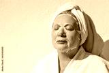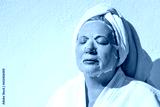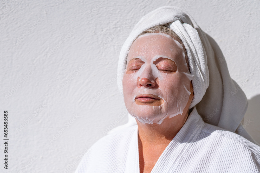 Mature woman applied a cosmetological mask for facial skin care after a shower
