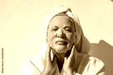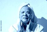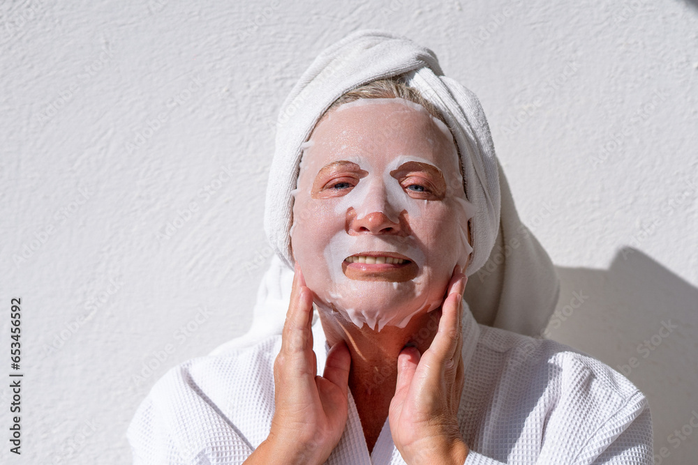 Mature woman applied a cosmetological mask for facial skin care after a shower