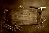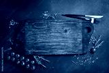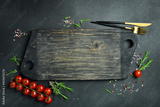 Creative kitchen banner. Cutting board, cutlery, spices and kitchen utensils on black stone background. Free space for text.