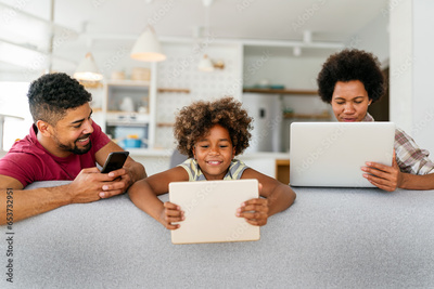 Obsessed to tech devices happy african american family using digital tablet, computer, smartphones