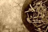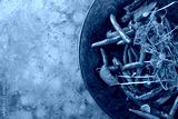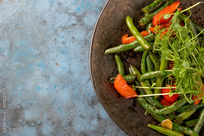 Garnish of asparagus, bell pepper, microgreens on blue grey background. Top view.