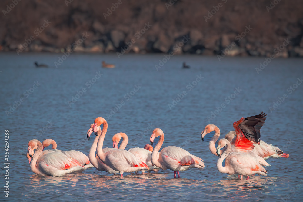Flamingos feeding food in a sea lake water. Flamingo flying in a sky.