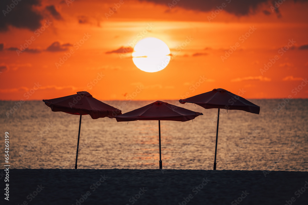 Sunrise over the sea horizon and beach shore sand with umbrella silhouettes and flying freedom birds