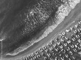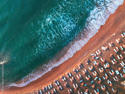 Aerial top view from drone of sandy beach with turquoise sea waves, parasols and lounge chairs with copy space for text