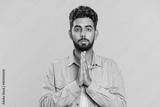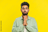 Please, God help. Indian man praying looking at camera and making wish, asking with hopeful imploring expression, begging apology, meditation. Arabian Hindu guy isolated on yellow studio background