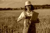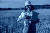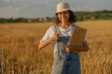 Smiling woman agronomist with tablet standing in wheat field and showing thumb up