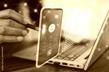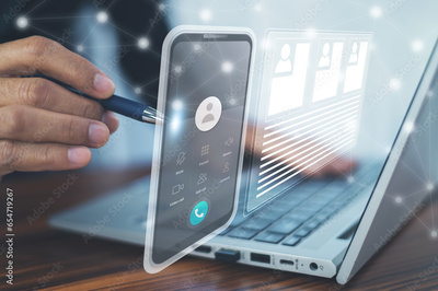 Business person using smartphone and working on computer against technology background, AI technology management.
