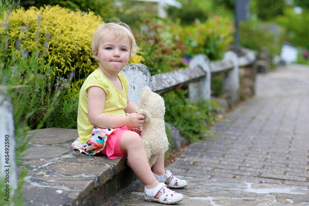 Cute little girl playing with teddy bear on the street