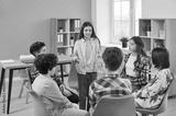 School children having a discussion. Group of boys and girls sitting in a circle in the classroom and listening to their friend who is speaking and making a suggestion about something