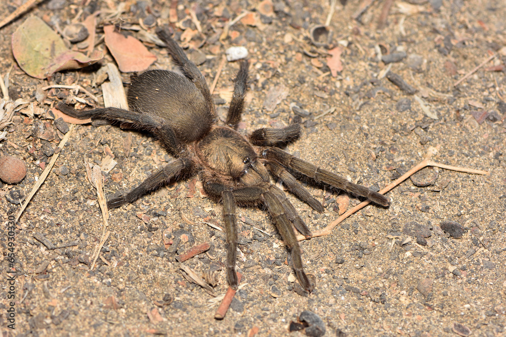 Closeup of the Middle East gold tarantula Chaetopelma olivaceum (Araneae: Theraphosidae), one of the largest Mediterranean spider species photographed in its biotope in Paphos, Cyprus.